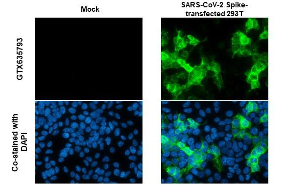 SARS-CoV-2 (COVID-19) Spike RBD antibody [HL1004] detects SARS-CoV-2 (COVID-19) Spike RBD protein by immunofluorescent analysis. Sample: Mock and transfected 293T cells were fixed in 4% paraformaldehyde at RT for 15 min. Green: SARS-CoV-2 (COVID-19) Spike RBD stained by SARS-CoV-2 (COVID-19) Spike RBD antibody [HL1004] (GTX635793) diluted at 1:600. Blue: Fluoroshield with DAPI (GTX30920).