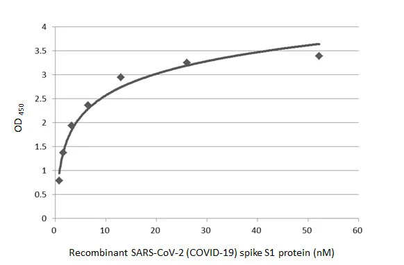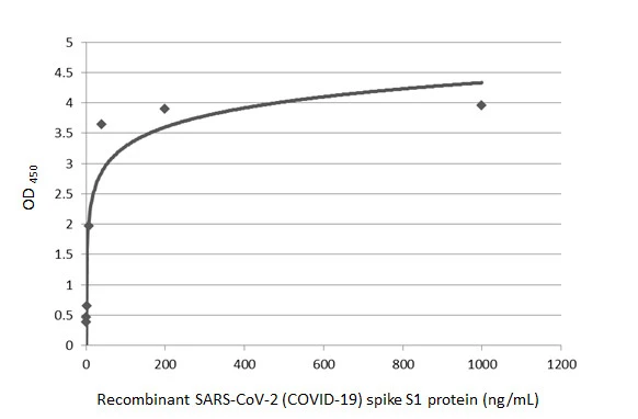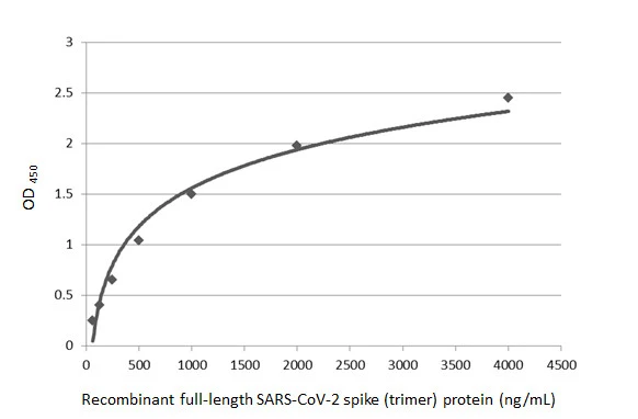 Sandwich ELISA detection of recombinant full-length SARS-CoV-2 spike (trimer) protein using SARS-CoV / SARS-CoV-2 (COVID-19) spike antibody [1A9] (GTX632604) as capture antibody at concentration of 5 µg/mL and SARS-CoV-2 (COVID-19) Spike RBD antibody [HL1004] (GTX635793) as detection antibody at concentration of 1 µg/mL. Rabbit IgG antibody (HRP) (GTX213110-01) was diluted at 1:10000 and used to detect the primary antibody.