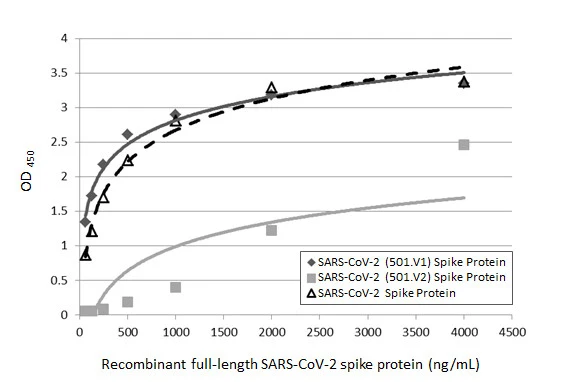 Sandwich ELISA detection of recombinant Spike ECD protein(s) derived from different strains of SARS-CoV-2 virus (ie., Wild type; B1.617.2 delta variant; B.1.1.7 alpha variant; B.1.351 beta variant; P.1 gamma variant) using antibodies as below. Capture: SARS-CoV-2 (COVID-19) Spike RBD antibody [HL1014] (GTX635807) (5 µg/mL) Detection: HRP-conjugated SARS-CoV-2 (COVID-19) Spike RBD antibody [HL1004] (GTX635793) (1 µg/mL) Please notice that GTX635793 needs to be conjugated to HRP to function as the detection antibody when paired with GTX635807. Please contact us for custom HRP-conjugated antibody.