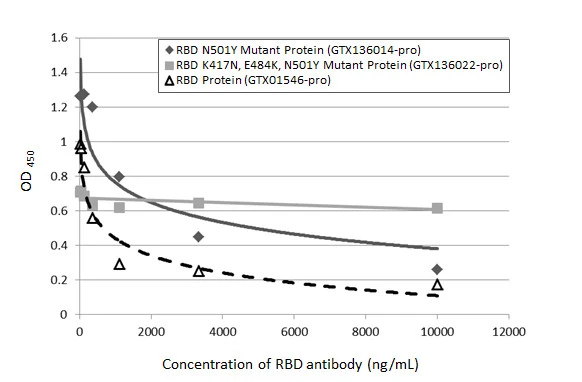 Inhibition analysis of immobilized recombinant SARS-CoV-2 (COVID-19) Spike RBD (N501Y Mutant) protein, His tag (active) (GTX136014-pro), SARS-CoV-2 (COVID-19) Spike RBD (K417N, E484K, N501Y Mutant) protein, His tag (active) (GTX136022-pro), and SARS-CoV-2 (COVID-19) Spike RBD protein, His tag (active) (GTX01546-pro) (coated at 2 µg/mL) binding to soluble recombinant Human ACE2 (ECD) protein , mouse IgG Fc tag (GTX135683-pro) (1000 ng/mL). ACE2 binding was inhibited by increasing concentrations of SARS-CoV-2 (COVID-19) Spike RBD antibody [HL1004] (GTX635793) (14-10000 ng/mL). Bound ACE2 protein was detected by Goat Anti-Mouse IgG antibody (HRP) (13111-01) (1:10000).