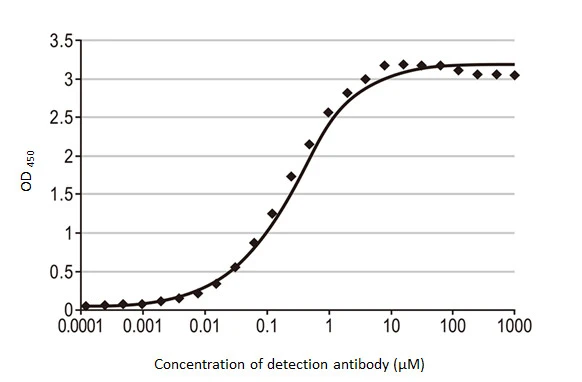 Indirect ELISA analysis performed by coating plate with recombinant SARS-CoV-2 Spike S1 (T19R, G142D, EF156-157del, R158G, L452R, T478K, D614G, P681R), His Tag (delta variant) (52.15-0.81 nM). Coated protein was probed with SARS-CoV-2 (COVID-19) Spike RBD antibody [HL1004] (GTX635793) (1 µg/mL). Rabbit IgG antibody (HRP) (GTX213110-01) (1:10000) was used to detect bound primary antibody.
