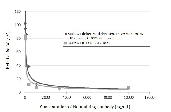 Inhibition analysis of immobilized recombinant SARS-CoV-2 (COVID-19) Spike S1 (del69-70, del44, N501Y, A570D, D614G...) Protein, His tag (active) (UK variant) (GTX136085-pro) and SARS-CoV-2 (COVID-19) Spike S1 protein, His tag (active) (GTX135817-pro) (coated at 2 µg/mL) binding to soluble recombinant Human ACE2 (ECD) protein, mouse IgG Fc tag (active) (GTX135683-pro) (1000 ng/mL). ACE2 binding was inhibited by increasing concentrations of SARS-CoV-2 (COVID-19) Spike RBD antibody [HL1004] (GTX635793) (13.72-10000 ng/mL). Bound ACE2 was detected by Goat Anti-Mouse IgG antibody (HRP) (GTX213111-01) (1:10000).
