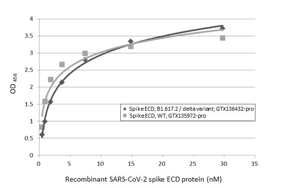 Indirect ELISA analysis performed by coating plate with recombinant Spike ECD protein(s) derived from different strains of SARS-CoV-2 virus (ie., Wild type; B1.617.2 delta variant) (29.71-0.46 nM). Coated protein was probed with SARS-CoV-2 (COVID-19) Spike RBD antibody [HL1004] (GTX635793) (1 µg/mL). Goat anti-rabbit IgG antibody (HRP) (GTX213110-01) (1:10000) was used to detect bound primary antibody.