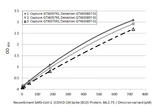 Sandwich ELISA detection of SARS-CoV-2 (COVID-19) Spike (ECD) Protein, Omicron / BA.2.75 variant, His tag (GTX137533-pro) using ELISA pairs below. Pair 1: Capture: SARS-CoV-2 (COVID-19) Spike RBD antibody [HL1003] (GTX635792) (5 µg/mL) Detection: SARS-CoV-2 (COVID-19) Spike RBD antibody [HL1014] (HRP) (GTX635807-01) (1 µg/mL) Pair 2: Capture: SARS-CoV-2 (COVID-19) Spike RBD antibody [HL1004] (GTX635793) (5 µg/mL) Detection: SARS-CoV-2 (COVID-19) Spike RBD antibody [HL1014] (HRP) (GTX635807-01) (1 µg/mL) Pair 3: Capture: SARS-CoV-2 (COVID-19) Spike RBD Omicron antibody [HL1866] (GTX637591) (5 µg/mL) Detection: SARS-CoV-2 (COVID-19) Spike RBD antibody [HL1014] (HRP) (GTX635807-01) (1 µg/mL)