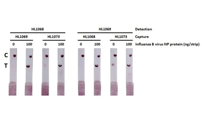 Detection of recombinant influenza B virus nucleoprotein (NP) (B/Sydney/3/2004), DDDDK Tag (GTX135867-pro) by lateral flow assay using the indicated recombinant rabbit monoclonal antibody pairs. HL1068 : Influenza B virus Nucleoprotein antibody [HL1068] (GTX636099) HL1069 : Influenza B virus Nucleoprotein antibody [HL1069] (GTX636100) HL1073 : Influenza B virus Nucleoprotein antibody [HL1073] (GTX636194) Sample : Influenza B virus Nucleoprotein (NP) (B/Sydney/3/2004), DDDDK Tag (GTX135867-pro)