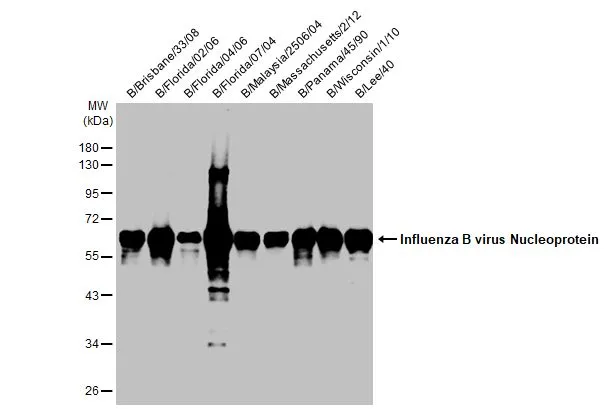 | Immunogen: | Recombinant protein encompassing a sequence within the N-terminus region of Influenza B virus Nucleoprotein (B/Taiwan/753/2005). The exact sequence is proprietary. |