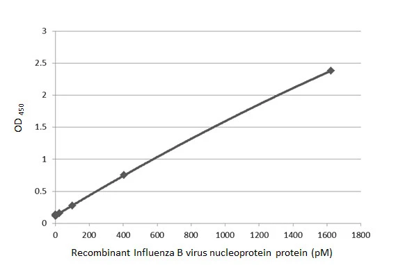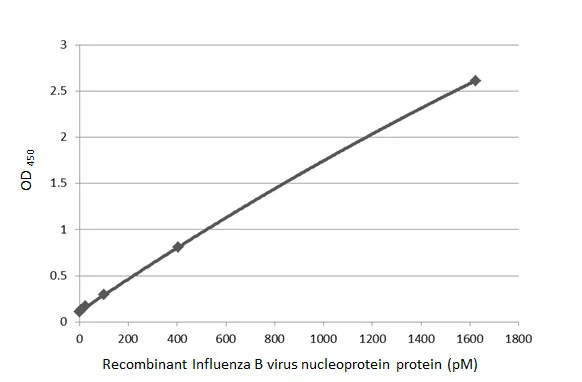 Sandwich ELISA detection of recombinant Influenza B virus Nucleoprotein (B/Sydney/3/2004), DDDDK Tag (GTX135867-pro) using antibodies as below. Capture: Influenza B virus Nucleoprotein antibody [HL1069] (GTX636100) (5 µg/mL) Detection: HRP-conjugated Influenza B virus Nucleoprotein antibody [HL1073] (GTX636194) (1 µg/mL) Please notice that GTX636194 needs to be conjugated to HRP to function as the detection antibody when paired with GTX636100. Please contact us for custom HRP-conjugated antibody.