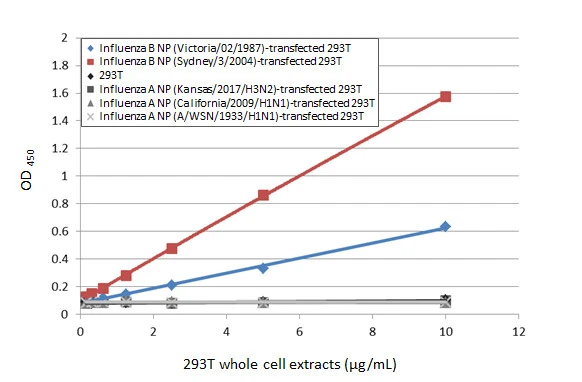 Sandwich ELISA detection of non-transfected and transfected 293T whole cell extracts using Influenza B virus Nucleoprotein antibody [HL1073] (GTX636194) as capture antibody at concentration of 5 µg/mL and HRP-conjugated Influenza B virus Nucleoprotein antibody [HL1069] (GTX636100) as detection antibody at concentration of 1 µg/mL. Please notice that GTX636100 needs to be conjugated to HRP to function as the detection antibody when paired with GTX636194. Please contact us for custom HRP-conjugated antibody.