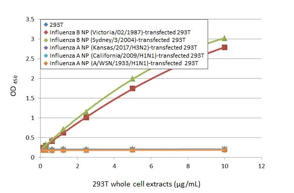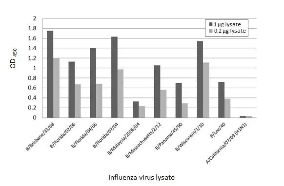 Sandwich ELISA detection of viral lysate derived from different strains of Influenza A virus (i.e., A/California/07/09 (H1N1)) and Influenza B virus (i.e., B/Brisbane/33/08; B/Florida/02/06; B/Florida/04/06; B/Florida/07/04; B/Massachusetts/2/12; B/Panama/45/90; B/Wisconsin/1/10) using antibodies as below. Capture: Influenza B virus Nucleoprotein antibody [HL1068] (GTX636099) (5 µg/mL) Detection: HRP-conjugated Influenza B virus Nucleoprotein antibody [HL1069] (GTX636100) (1 µg/mL) Please notice that GTX636100 needs to be conjugated to HRP to function as the detection antibody when paired with GTX636099. Please contact us for custom HRP-conjugated antibody.