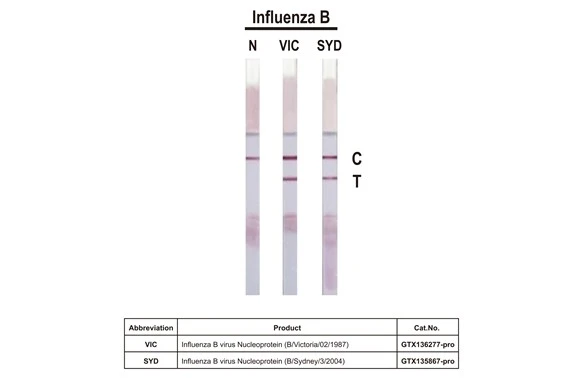 Detection of recombinant influenza B virus nucleoproteins of the indicated strains by lateral flow assay using the recombinant rabbit monoclonal antibody pair. Capture: Influenza B virus Nucleoprotein antibody [HL1069] (GTX636100) Detection: Influenza B virus Nucleoprotein antibody [HL1068] (GTX636099)