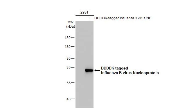 Non-transfected (-) and transfected (+) 293T whole cell extracts (30 µg) were separated by 7.5% SDS-PAGE, and the membrane was blotted with Influenza B virus Nucleoprotein antibody [HL1069] (GTX636100) diluted at 1:20000. The HRP-conjugated anti-rabbit IgG antibody (GTX213110-01) was used to detect the primary antibody.