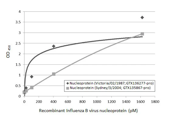 Sandwich ELISA detection of recombinant nucleoproteins (NP) derived from different strains of Influenza B virus (i.e., B/Sydney/3/2004; B/Victoria/02/1987) using antibodies as below. Capture: Influenza B virus Nucleoprotein antibody [HL1073] (GTX636194) (5 µg/mL) Detection: HRP-conjugated Influenza B virus Nucleoprotein antibody [HL1069] (GTX636100) (1 µg/mL). Please notice that GTX636100 needs to be conjugated to HRP to function as the detection antibody when paired with GTX636194. Please contact us for custom HRP-conjugated antibody.