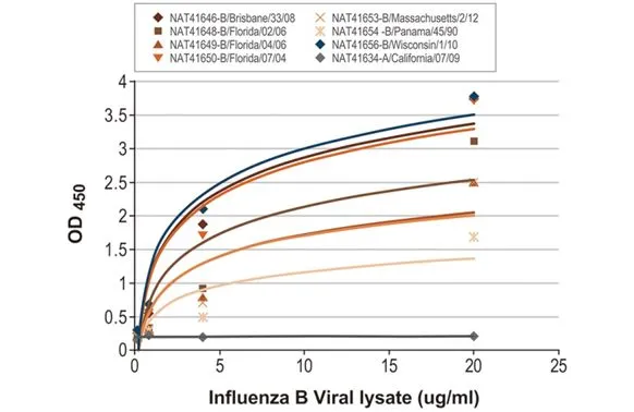 Sandwich ELISA detection of viral lysate derived from different strains of Influenza A virus (i.e., A/California/07/09 (H1N1)) and Influenza B virus (i.e., B/Brisbane/33/08; B/Florida/02/06; B/Florida/04/06; B/Florida/07/04; B/Massachusetts/2/12; B/Panama/45/90; B/Wisconsin/1/10) using antibodies as below. Capture: Influenza B virus Nucleoprotein antibody [HL1073] (GTX636194) (5 µg/mL) Detection: HRP-conjugated Influenza B virus Nucleoprotein antibody [HL1069] (GTX636100) (1 µg/mL) Please notice that GTX636100 needs to be conjugated to HRP to function as the detection antibody when paired with GTX636194. Please contact us for custom HRP-conjugated antibody.