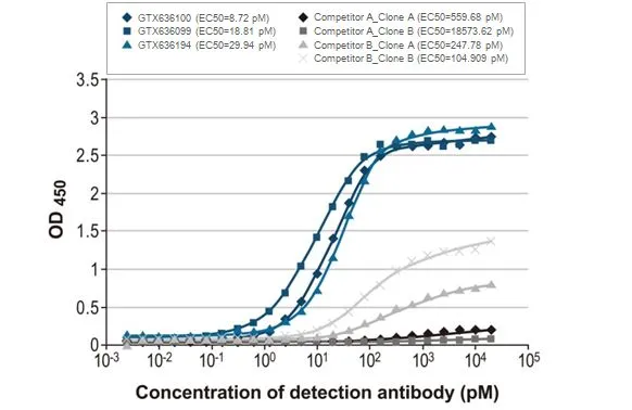 Indirect ELISA analysis performed by coating plate with recombinant full-length Influenza B virus NP (nucleoprotein) protein, DDDDK tag (GTX135867-pro) (50 ng). Coated protein was probed with Influenza B virus Nucleoprotein antibody [HL1069] (GTX636100) (20000-4.77*10-3 pM). Rabbit IgG antibody (HRP) (GTX213110-01) (1:10000) was used to detect bound primary antibody. EC50 : 8.72 pM