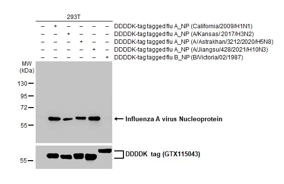 Non-transfected (-) and transfected (+) 293T whole cell extracts were separated by 10% SDS-PAGE, and the membrane was blotted with Influenza A virus NP (nucleoprotein) antibody [HL1078] (GTX636199) diluted at 1:5000. The HRP-conjugated anti-rabbit IgG antibody (GTX213110-01) was used to detect the primary antibody.