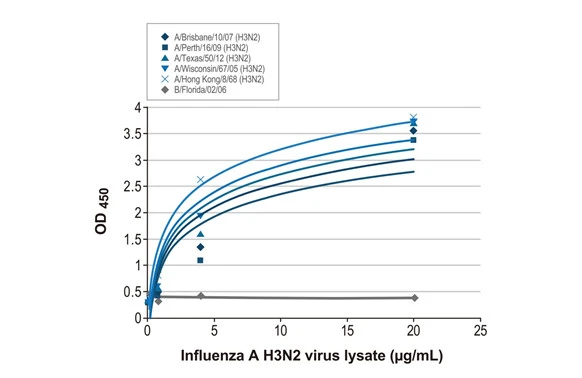 Sandwich ELISA detection of viral lysate derived from different strains of Influenza A virus (i.e., A/Brisbane/10/07 (H3N2); A/Perth/16/09 (H3N2); A/Texas/50/12 (H3N2); A/Wisconsin/67/05 (H3N2); A/Hong Kong/8/68 (H3N2)) and Influenza B virus (i.e., B/Florida/02/06) using antibodies as below. Capture: Influenza A virus Nucleoprotein antibody [HL1103] (GTX636318) (5 µg/mL) Detection: HRP-conjugated Influenza A virus Nucleoprotein antibody [HL1089] (GTX636247) (1 µg/mL) Please notice that GTX636247 needs to be conjugated to HRP to function as the detection antibody when paired with GTX636318. Please contact us for custom HRP-conjugated antibody.