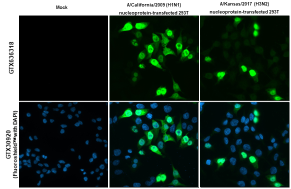 Influenza A virus Nucleoprotein antibody (GTX636318) detects overexpressed Influenza virus Nucleoprotein protein by immunofluorescent analysis. Sample: Mock and transfected 293T cells were fixed in 4% paraformaldehyde at RT for 15 min. Green: Influenza A virus Nucleoprotein stained by Influenza A virus Nucleoprotein antibody (GTX636318) diluted at 1:2000.
