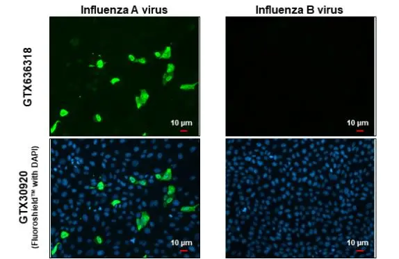 Immunofluorescent analysis of influenza virus infected cells using Influenza A virus Nucleoprotein antibody (GTX636318). Sample: Influenza A and B Virus infected cells slide. Green: Influenza A virus Nucleoprotein antibody (GTX636318) diluted at 1:100.