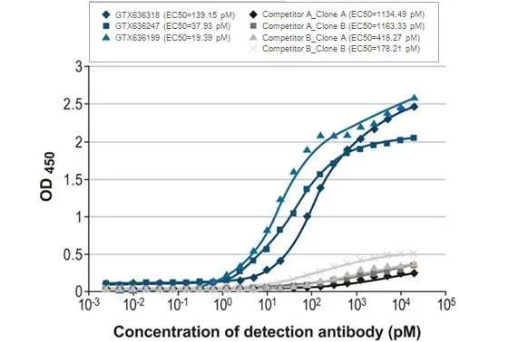 Indirect ELISA analysis performed by coating plate with recombinant full-length Influenza A virus NP (nucleoprotein) antibody (GTX135903-pro) (50 ng). Coated protein was probed with Influenza B virus Nucleoprotein antibody [HL1069] (GTX636100) (20000-4.77*10-3 pM). Rabbit IgG antibody (HRP) (GTX213110-01) (1:10000) was used to detect bound primary antibody. EC50 : 139.15 pM