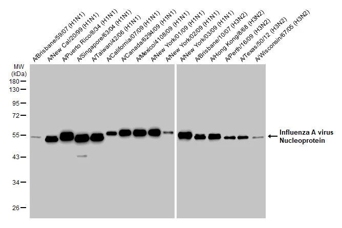 Influenza A viral lysate (1 µg) were separated by 10% SDS-PAGE, and the membrane was blotted with Influenza A virus Nucleoprotein antibody [HL1103] (GTX636318) diluted at 1:1000. The HRP-conjugated anti-rabbit IgG antibody (GTX213110-01) was used to detect the primary antibody.