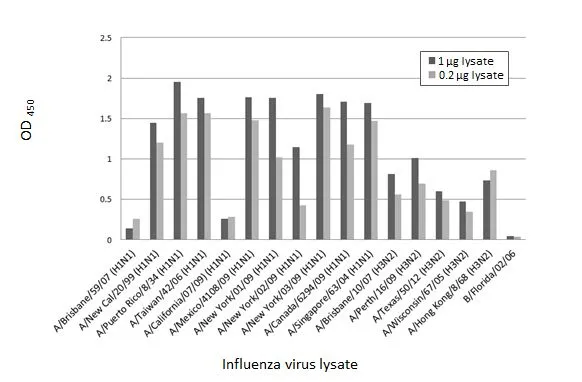 Sandwich ELISA detection of viral lysate derived from different strains of Influenza A virus (i.e., A/Brisbane/59/07 (H1N1); A/New Cal/20/99 (H1N1); A/Puerto Rico/8/34 (H1N1); A/Taiwan/42/06 (H1N1); A/Singapore/63/04 (H1N1); A/California/07/09 (H1N1); A/Mexico/4108/09 (H1N1); A/New York/01/09 (H1N1); A/New York/02/09 (H1N1); A/New York/03/09 (H1N1); A/Canada/6294/09 (H1N1)) and Influenza B virus (i.e., B/Florida/02/06) using antibodies as below. Capture: Influenza A virus Nucleoprotein antibody [HL1103] (GTX636318) (5 µg/mL) Detection: HRP-conjugated Influenza A virus Nucleoprotein antibody [HL1089] (GTX636247) (1 µg/mL) Please notice that GTX636247 needs to be conjugated to HRP to function as the detection antibody when paired with GTX636318. Please contact us for custom HRP-conjugated antibody.