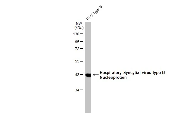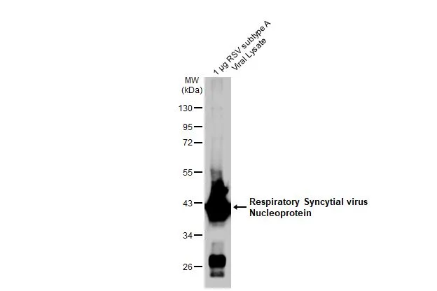 Respiratory syncytial virus lysate (1 µg) was separated by 10% SDS-PAGE, and the membrane was blotted with Respiratory Syncytial virus Nucleoprotein antibody [HL1247] (GTX636649) diluted at 1:1000. The HRP-conjugated anti-rabbit IgG antibody (GTX213110-01) was used to detect the primary antibody.