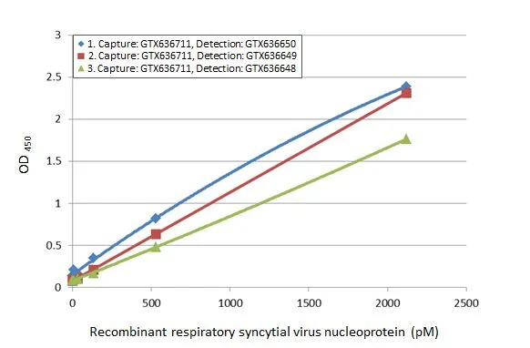 Sandwich ELISA detection of recombinant HEK293 expressed, full-length respiratory syncytial virus nucleoprotein using ELISA pairs below. Pair 1: Capture: Respiratory Syncytial virus Nucleoprotein antibody (GTX636650) (5 µg/mL) Detection: Respiratory Syncytial virus Nucleoprotein antibody [HL1247] (GTX636649) conjugated with HRP (1 µg/mL) Pair 2: Capture: Respiratory Syncytial virus Nucleoprotein antibody [HL1246 (GTX636648) (5 µg/mL) Detection: Respiratory Syncytial virus Nucleoprotein antibody [HL1248] (GTX636650) conjugated with HRP (1 µg/mL) Pair 3: Capture: Respiratory Syncytial virus Nucleoprotein antibody [HL1246 (GTX636648) (5 µg/mL) Detection: Respiratory Syncytial virus Nucleoprotein antibody [HL1247] (GTX636649) conjugated with HRP (1 µg/mL) Please notice that detection antibodies need to be conjugated to HRP to function when paired with capture one.Please contact us for custom HRP-conjugated antibody.