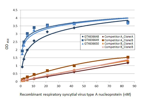 Sandwich ELISA detection of recombinant HEK293 expressed, full-length respiratory syncytial virus nucleoprotein using ELISA pairs below. Pair 1: Capture: Respiratory Syncytial virus Nucleoprotein antibody (GTX636650) (5 µg/mL) Detection: Respiratory Syncytial virus Nucleoprotein antibody [HL1247] (GTX636649) conjugated with HRP (1 µg/mL) Pair 2: Capture: Respiratory Syncytial virus Nucleoprotein antibody [HL1246 (GTX636648) (5 µg/mL) Detection: Respiratory Syncytial virus Nucleoprotein antibody [HL1248] (GTX636650) conjugated with HRP (1 µg/mL) Pair 3: Capture: Respiratory Syncytial virus Nucleoprotein antibody [HL1246 (GTX636648) (5 µg/mL) Detection: Respiratory Syncytial virus Nucleoprotein antibody [HL1247] (GTX636649) conjugated with HRP (1 µg/mL) Please notice that detection antibodies need to be conjugated to HRP to function when paired with capture one.Please contact us for custom HRP-conjugated antibody.