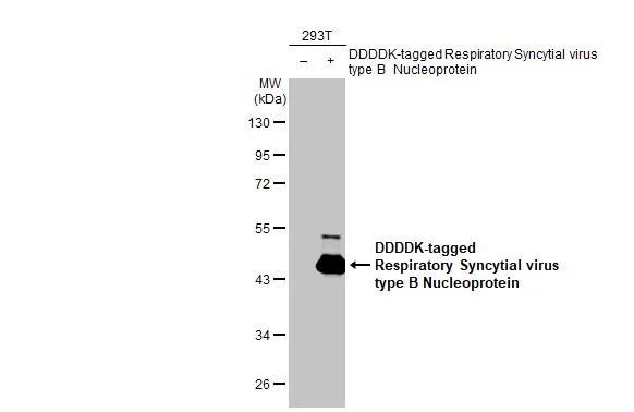 Non-transfected (-) and transfected (+) 293T whole cell extracts (30 µg) were separated by 10% SDS-PAGE, and the membrane was blotted with Respiratory Syncytial virus Nucleoprotein antibody [HL1248] (GTX636650) diluted at 1:5000. The HRP-conjugated anti-rabbit IgG antibody (GTX213110-01) was used to detect the primary antibody.
