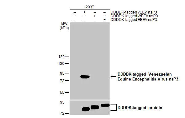 | Immunogen: | Recombinant protein encompassing a sequence within the center region of Venezuelan equine encephalitis virus nsp3.(strain# P676) |