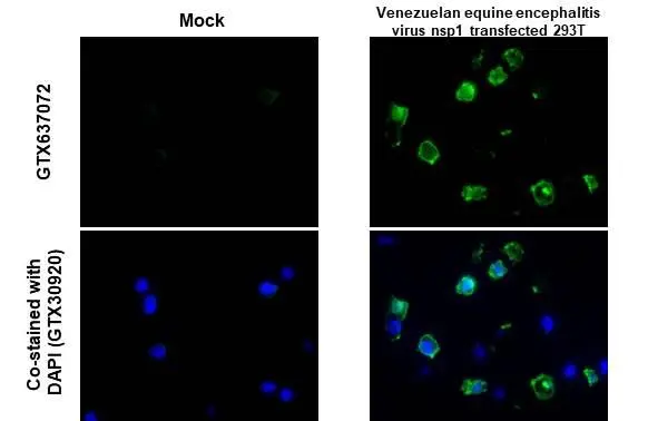| Immunogen: | Recombinant protein encompassing a sequence within the center region of Venezuelan equine encephalitis virus nsp1. The exact sequence is proprietary. |