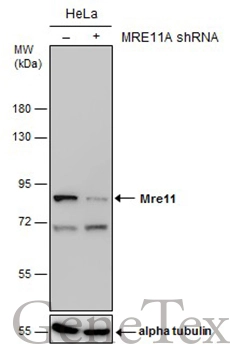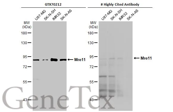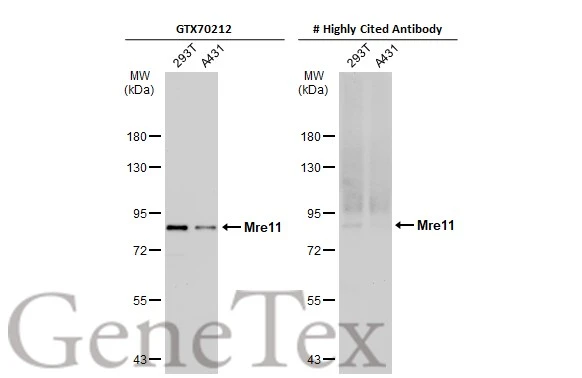 MRE11 antibody recognizes MRE11 protein, an enzyme with a predicted molecular weight of ~81 kDa. MRE11 forms the core of the MRN (MRE11-RAD50-NBS1) complex, one of the first components of the DNA damage response (DDR) to DNA double-strand breaks where it recruits other signaling factors required for repair. MRE11 has both exonuclease and endonuclease activities, and is responsible for the DNA binding of the complex.