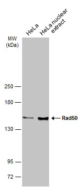 Rad50 antibody detects RAD50, a ~154 kDa protein that, together with MRE11 and NBS1, forms the MRN complex that is intimately involved in DNA damage signaling, DNA double-strand break (DSB) repair, recombination, and replication. The complex is also involved other facets of genomic homeostasis including telomere maintenance. MRN plays a pivotal role in the DNA damage response (DDR) through interactions with ATM and ATR.