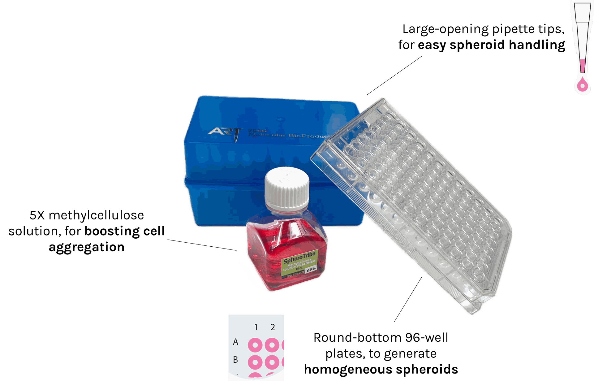 Description: SpheroTribe offers a simple method to generate circular 3D spheroids with increased control over their size and shape, which can be easily handled and washed for downstream experiments. The full kit also includes U-bottom plates and wide-opening tips so you have everything you need to get started with your 3D cell culture experiments. SpheroTribe is particularly useful to boost aggregation when working with challenging cells, minimize variability between samples and improve the consistency of your migration/invasion assays, immunostaining, drug screening or in vivo implantation experiments.