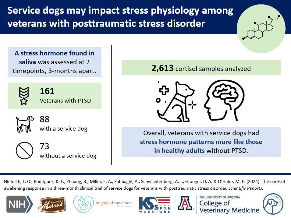 Overall, veterans with service dogs had stress hormone patterns more like those in healthy adults without PTSD.