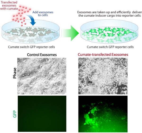Small moleculae drugs can also be Exo-Fected into exosomes for delivery to target cells. SBI’s cumate system features a cumate switch promoter that is highly suppressed by its cognate CymR repressor protein abd can switch on with the addition of the small moleucle inducer, cumate. We tested the loading of cumate into exosomes using the Exo-Fect system and then added those exosomes to cells containing a cumate switch GFP reporter construct. The control exosomes were untransfected exosomes