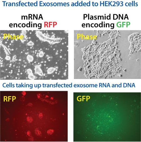 xoFect kits work with longer RNAs, like mRNA. We transfected 1 ug of an mRNA encoding RFP into exosomes. These exosomes were then added to HEK293 cells and imaged for RFP protein production after 24 hours. Exo-Fect also enables the transfection of plasmid DNA into exosomes. We used 5 ug of plasmid DNA encoding a GFP gene, transfected exosomes and then added to HEK293 cells. The cells were imaged for GFP protein presence after 48 hours. The image data are shown below.