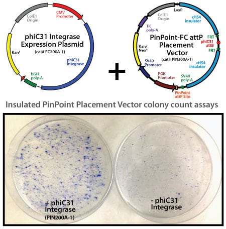 The PinPoint attP site was efficiently placed into HEK293 cells or HeLa cells. Approximately 8×10^5 cells were transfected with 40 ng PinPoint-FC placement vector (Cat# PIN300A-1) and 1,960 ng phiC31 integrase expression vector (Cat# PIN200A-1) at a 1:50 ratio, respectively. Positive cells were selected with 400 ug/ml G418 for 14 days. Six separate lines of HEK293 and HeLa cells were picked and expanded. After 11 days, the cells were fixed and stained with a solution of 50% methanol plus 1% methylene blue. The plates were washed twice with PBS and allowed to air dry. The number of visible colonies were imaged and colony number counts assessed.