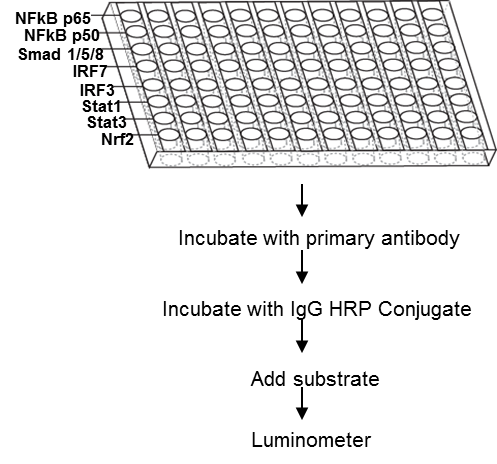 TF ELISA kit is high sensitive and specific assay with a simple and optimized procedure. The 96-well (8X12 strip) white plate is pre-immobilized with the TF consensus sequencing oligo. The activated TF in nuclear extract or the whole cell lysate is added in the well and binds to the oligo. The activated TF is detected with a specific antibody against the subunit and a HRP conjugated secondary antibody. After incubation, the wells are washed to remove unbound-labeled antibodies. The plate is further detected with HRP luminescent substrate. Luminescence is reported as relative light units (RLUs) on a microplate luminometer. The level of expression for each specific cytokine is directly proportional to the luminescent intensity.