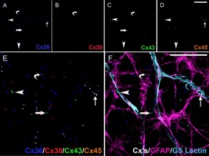 Six-marker immunohistochemistry was executed on retinal wholemount preparations. Connexin 26 (blue, Alexa Fluor® 532-conjugated anti-goat IgG), Connexin 30 (red, Cy3-conjugated anti-rabbit IgG), Connexin 43 (green, Alexa Fluor® 488-conjugated mouse IgG1), Connexin 45 (pale brown, Alexa Fluor® 594-conjugated anti-sheep IgG), GFAP stained for astrocytes (pale purple, Cy5-conjugated anti-chicken IgY), GS Isolectin B4 stained for blood vessels (turquoise, AMCA-conjugated streptavidin). Equipment used: