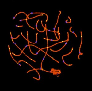 Human Spermatocyte at the Pachytene Stage showing yellow MLH1 recombination sites on red synaptonemal complexes with blue centromeres detected with Cy3 donkey anti-mouse antibody and AMCA donkey anti-human antibody, respectively .