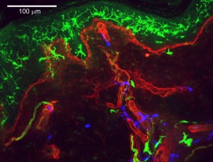 Vertical section of human thigh skin showing Langerhans cells (Cy2 – green) in the epidermis and migrating towards the superficial dermis. Basement membranes (Cy3, red) delineate the capillaries and the boundary between the epidermis and the dermis. Mast cells (Cy5, recoloured blue) are present near vessels.